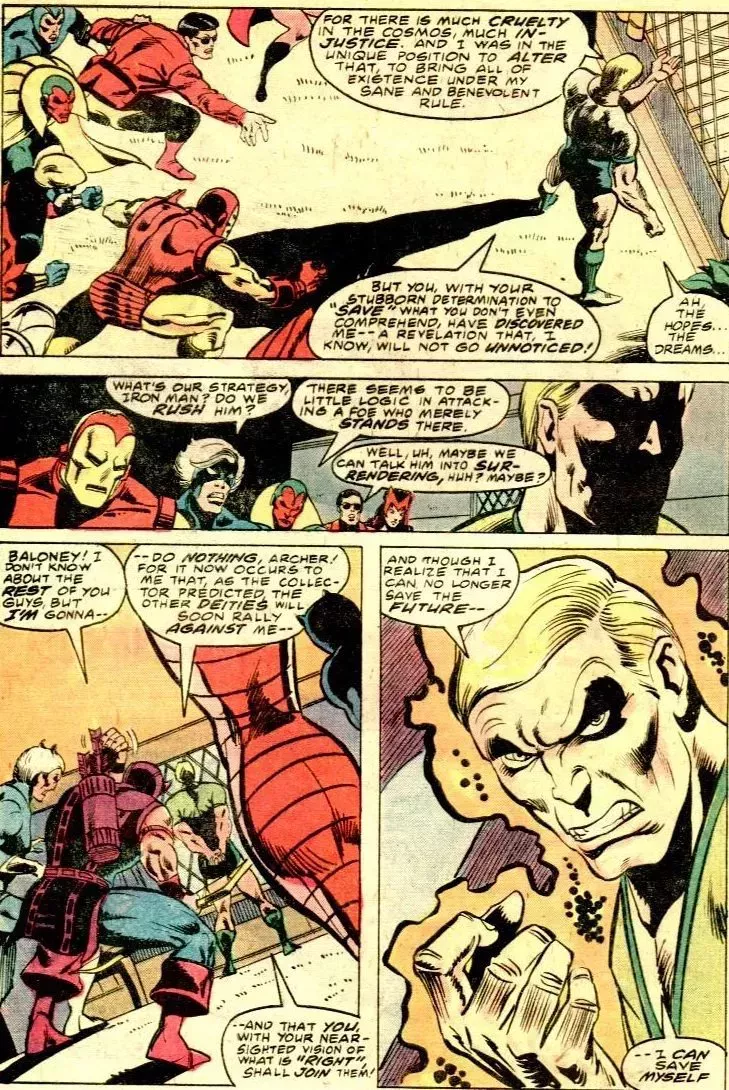 El Coleccionista intenta entonces capturar a los Vengadores (y a los Guardianes) en un intento de protegerlos de Korvac, pero cuando éste se entera de su plan, mata al Coleccionista.
