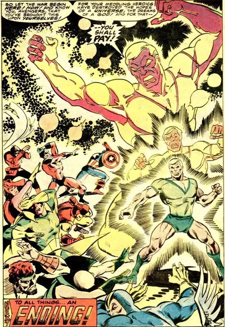 73. "The Korvac Saga" de Jim Shooter, Roger Stern, David Michelinie, George Pérez, Sal Buscema, David Wenzel y Pablo Marcos(Avengers #167-169, 170-171, 173-177) - 155 puntos (1 voto para el primer puesto)