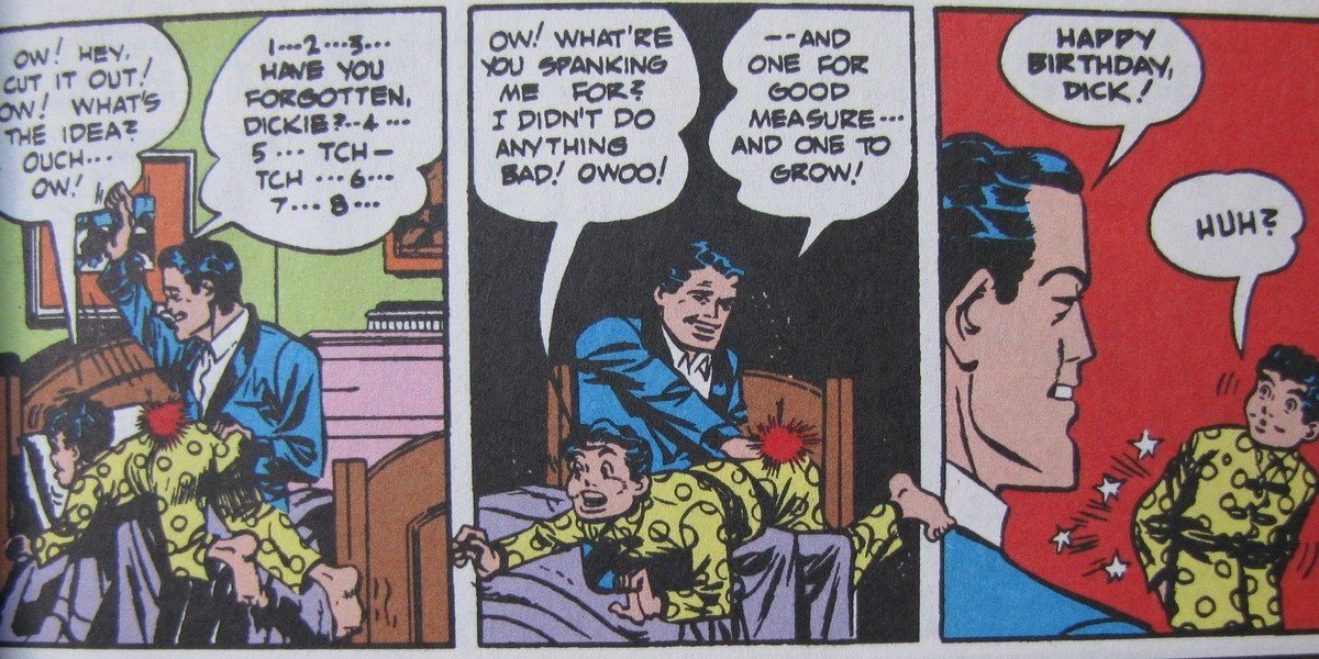 Batman azotó a su primer Chico Maravilla, Dick Grayson en su cumpleaños todos los años. Una cosa es disciplinar a un niño, pero otra cosa es azotar a su pupilo adoptivo en medio de la noche entrando a hurtadillas en su habitación.