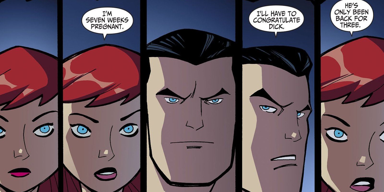 No sólo se equivocó Batman Dick Grayson, pero su Batgirl, Barbara Gordon en Batman Beyond 2.0. El"padre del año" se acostó con Barbara, la novia de Grayson, y la dejó embarazada. Se pone peor.