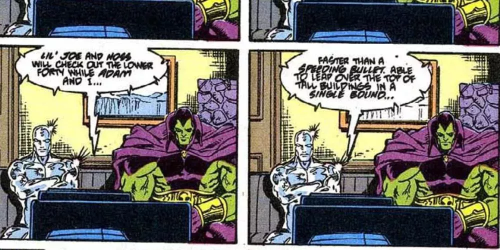 Tras fracasar en su intento de alejar a Drax de él, a Surfer se le ocurrió el plan de ver la televisión con Drax. Los dos disfrutaron de reposiciones de programas como I Love Lucy, Beverly Hillbillies y una curiosa serie clásica antigua sobre un personaje "más rápido que una bala veloz". Mientras Drax se distraía descubriendo que existían personajes de DC en el universo Marvel, Surfer pudo escabullirse.