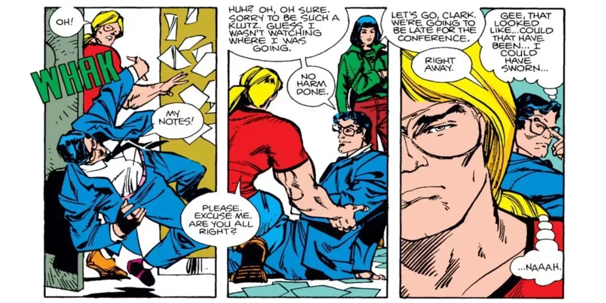 Después de disfrazarlo con ropa normal, Nick Fury le ofreció un par de gafas como toque final, alegando que siempre funcionaban para "el otro tipo" Como para llevar el chiste a casa, después, Thor sale de la oficina de Fury y se tropieza directamente con un doble de Clark Kent. Resulta hilarante que la comparación directa entre las identidades heroicas sólo hiciera que el "nuevo aspecto" de Thor pareciera más ridículo, ya que seguía midiendo casi dos metros y apenas cabía dentro de la ropa humana.