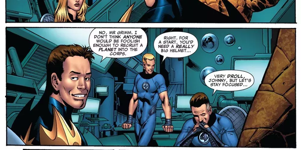 Richard lo descubrió a posteriori y acudió a los Cuatro Fantásticos para expresar su preocupación. Mientras discutían el tema, Richard señaló lo ridículo que sería hacer de un planeta un miembro de "los Cuerpos", estuviera vivo o no. Es un divertido ataque a uno de los mejores miembros de los Green Lantern Corps, Mogo.