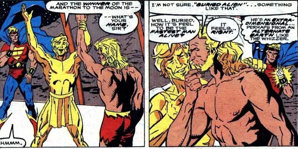 Sin embargo, durante la carrera, todos ellos fueron quemados por un único hombre de pelo rubio vestido con un andrajoso traje rojo y amarillo. El hombre había olvidado su nombre, y lo más cerca que estuvo de averiguarlo fue "Alien Enterrado". Obviamente, se trataba del velocista de DC Comics, después de que se hubiera topado con la Fuerza de la Velocidad derribando las armas del Antimonitor durante la Crisis de DC.