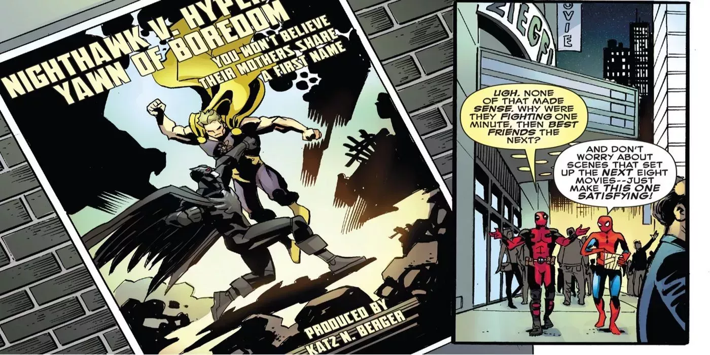 Tras frustrar un atentado contra Deadpool, los dos pudieron ver una nueva película titulada Nighthawk v. Hyperion: El bostezo del aburrimiento. Los fans más veteranos de Marvel Comics reconocerán a Nighthawk e Hyperion como los personajes Marvel que imitan a Batman y Superman. Al salir de la película, ambos se dan cuenta de lo ridículo que resulta que el conflicto de la película se resuelva cuando los héroes reconocen que su madre comparte el mismo apellido. Teniendo en cuenta que Batman vs. Superman era una película bastante nueva en aquel momento, los creadores definitivamente trabajaron rápido.