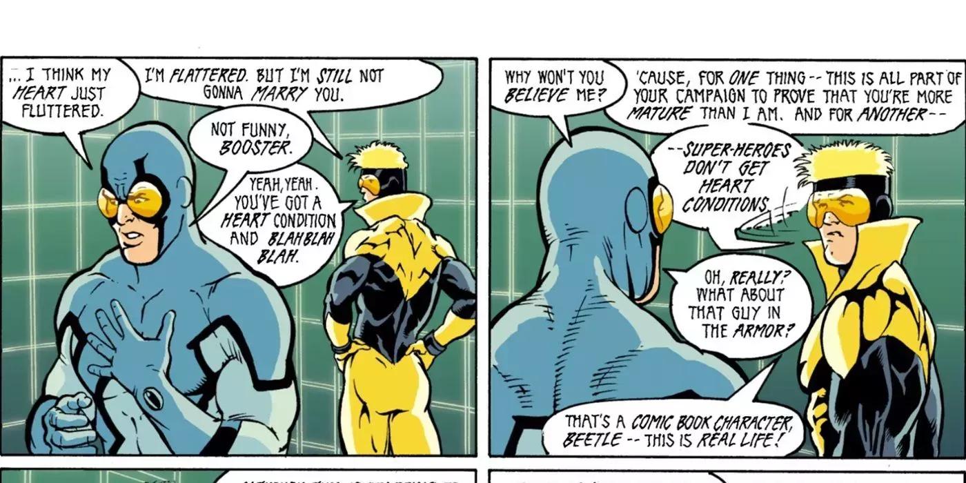 Por supuesto, esto es una referencia al Iron Man de la Edad de Plata, donde se sabe que Tony Stark lucha contra una afección cardíaca tanto como los villanos. Booster señala que el Vengador Blindado no es más que "un personaje de cómic", lo que resulta hilarante teniendo en cuenta que implica que Booster piensa que solo las personas sanas pueden convertirse en héroes.