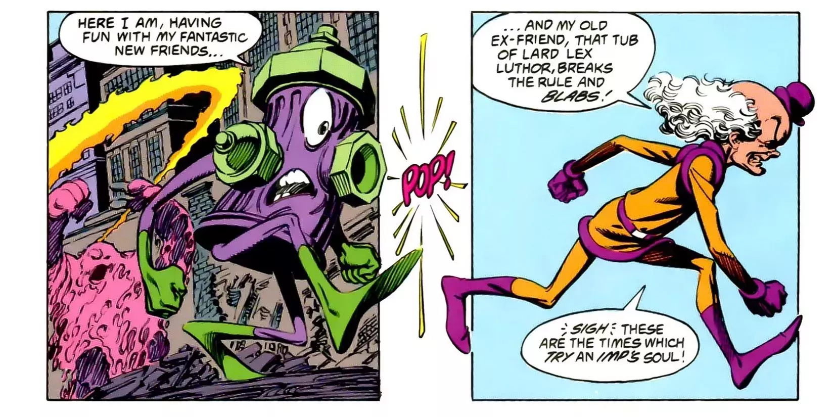 La mejor referencia a Marvel en DC Comics proviene de Superman vol. 2 #50. Aparece al final del arco argumental "Krysis of Krimson Kryptonite". Viene al final del arco argumental "Krysis of Krimson Kryptonite", donde Mr. Mxyzptlk le dio a Lex Luthor una forma de "hacer a Lex igual a Superman" quitándole sus poderes. Mxyzptlk construyó una forma para que Superman recuperara sus poderes: Lex explicando a Superman quién tomó sus poderes en primer lugar.