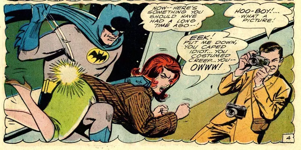 Tras una de esas acrobacias, en la que se subió a lo alto de un puente, Batman la bajó y le dio una paliza como disciplina. Al mismo tiempo, un fotógrafo que se parecía sospechosamente al clásico Peter Parker estaba por allí para tomar unas instantáneas, que acabaron en "The Daily Blade" al día siguiente. Es el tipo de cosas que hoy en día no pasarían desapercibidas, pero que eran divertidísimas en los años 60.