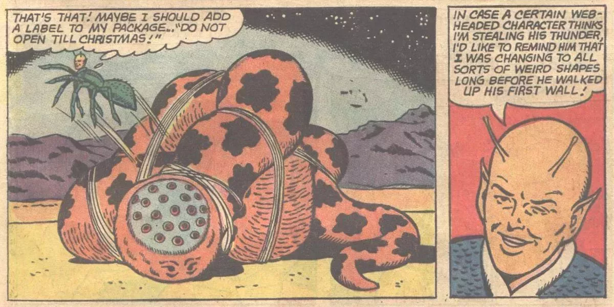 Sin embargo, una revancha posterior demuestra que la Legión de Superhéroes es superior. Durante el combate de Chameleon Boy, éste decide transformarse y utilizar las telarañas de una araña para impedir que su oponente se mueva. Como si les aterrorizara que los fans de Spider-Man les enviaran cartas, Chameleon Boy no tarda en señalar que lleva más tiempo que cierto "personaje con cabeza de telaraña".
