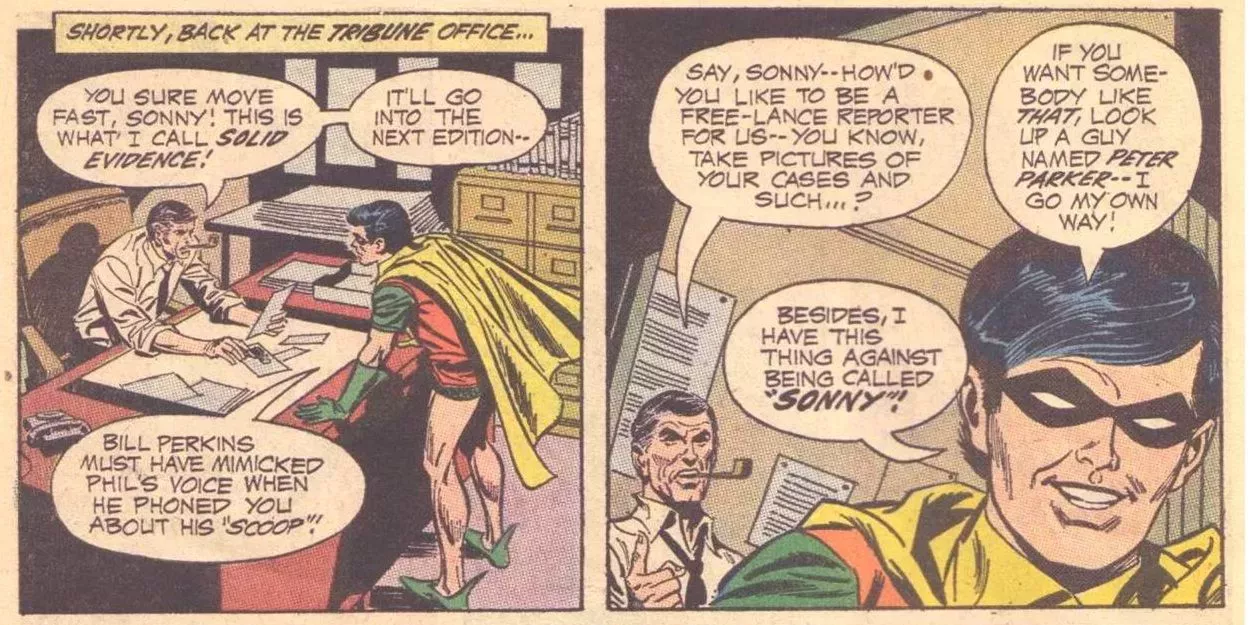 Tras encontrar a los responsables, Robin lleva pruebas fotográficas a un periódico. Antes de marcharse, el editor del periódico sugiere que Robin podría ganar dinero fácilmente haciendo fotos de sí mismo y de sus casos. Al darse cuenta de lo cerca que suena esto del trabajo de Spider-Man, Robin sugiere que el imitador de J. Jonah Jameson se suba al árbol de Peter Parker en lugar de al suyo.