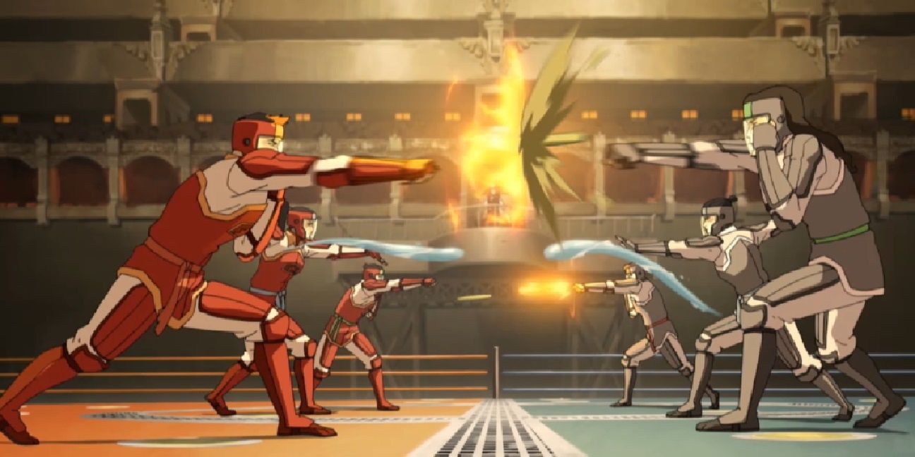 El Pro Bending era un deporte en el que los dobladores se enfrentaban entre sí con la intención de derribar a sus oponentes de la plataforma. Durante el último partido de los Hurones de Fuego, el equipo enemigo había pagado claramente al árbitro para hacer llamadas a su favor, hasta tal punto que incluso el anunciador se quedaba frecuentemente boquiabierto por su mal juicio.
