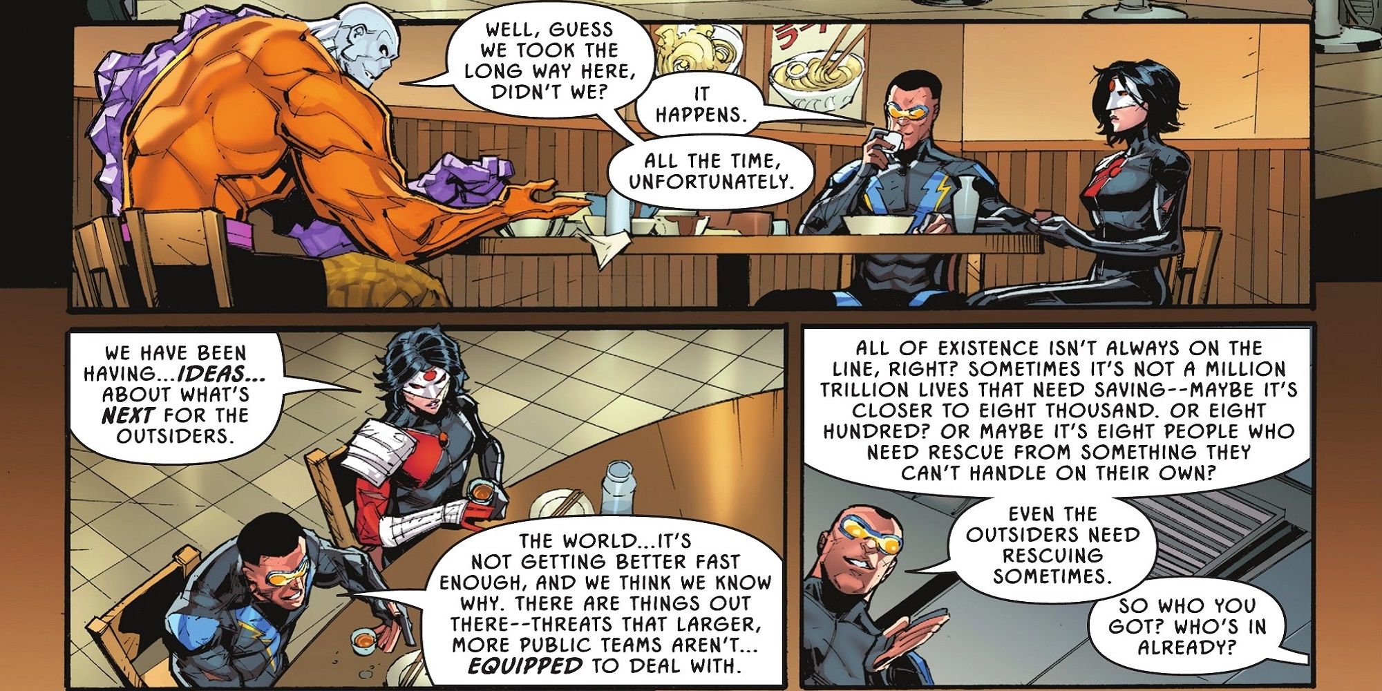No ha habido mucho desarrollo de los Outsiders desde que su cómic terminó hace un tiempo. Pero tuvieron su propia historia en Urban Legends, centrada en Rayo Negro, Katana y Metamorpho.
