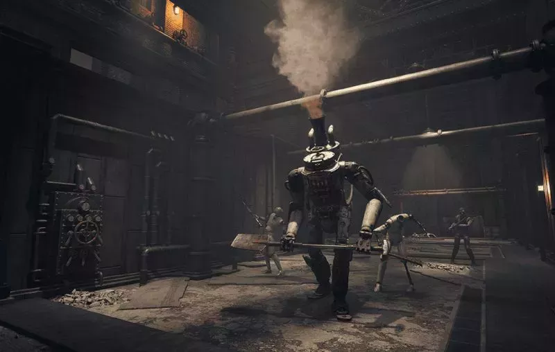 La segunda imagen es mucho más industrial, con una enorme turbina en el centro. Pinocho parece estar de pie junto a una cubierta que podrÃa estar controlando la turbina, y hay un hueco en el suelo en primer plano que parece haber sido destrozado.