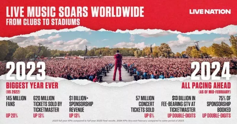 La multinacional, propietaria de Ticketmaster, publicó ayer (22 de febrero) su informe de fin de año. En él se afirma que la música en directo se disparó en todo el mundo durante esos 12 meses "desde los clubes hasta los estadios", con 145 millones de aficionados que asistieron a más de 50.000 eventos (un 20% más que en 2022).