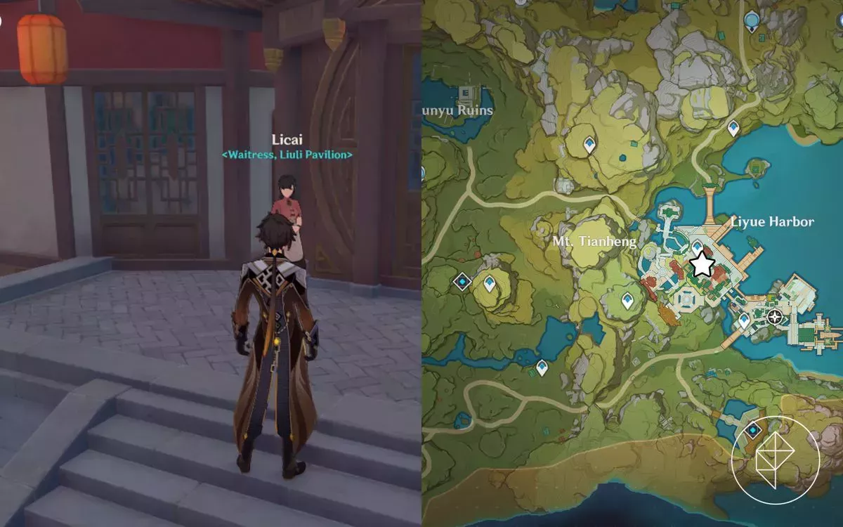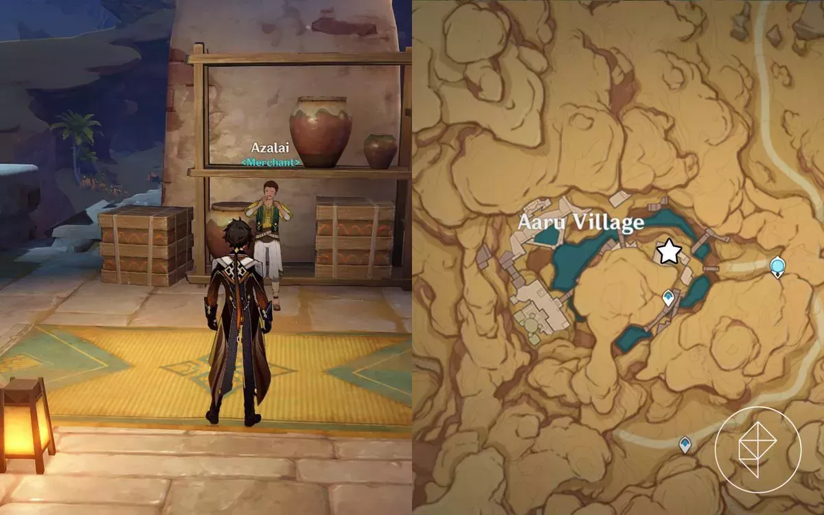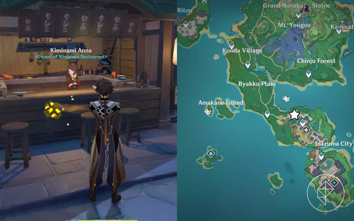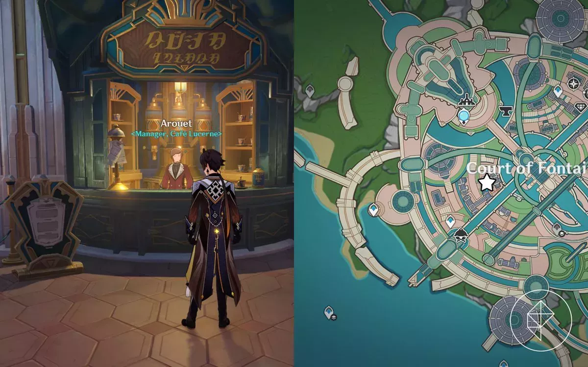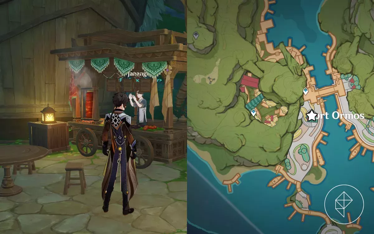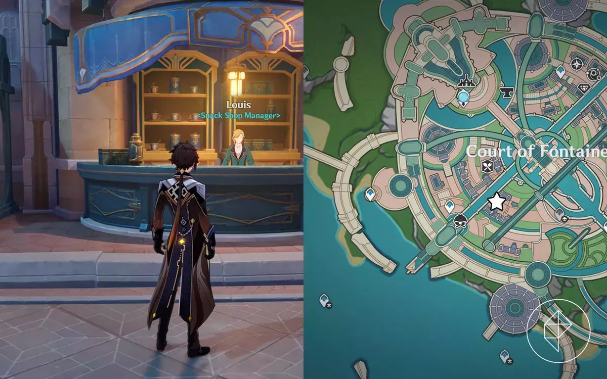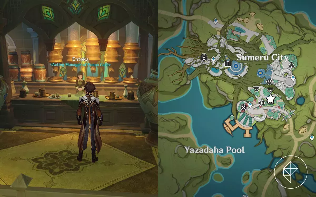 Enteka vende productos en la cafetería, marcada con una tetera en el mapa de Ciudad Sumeru.