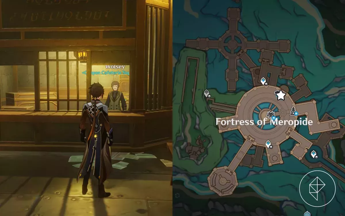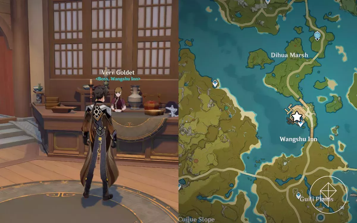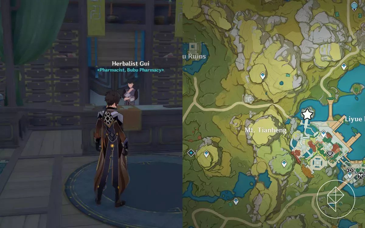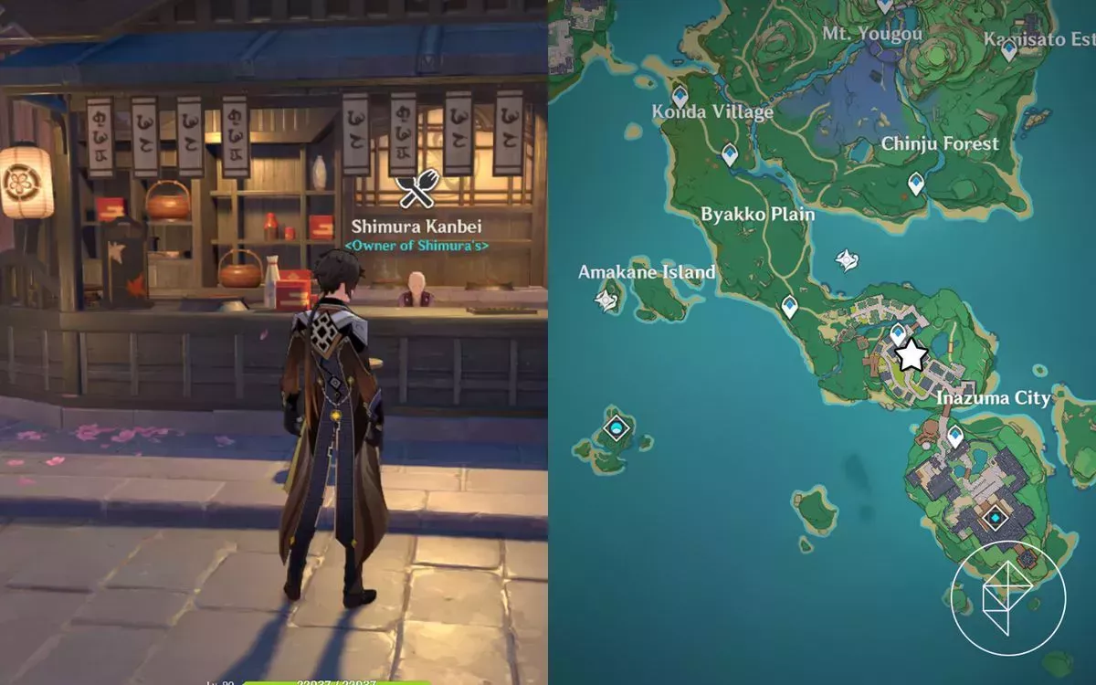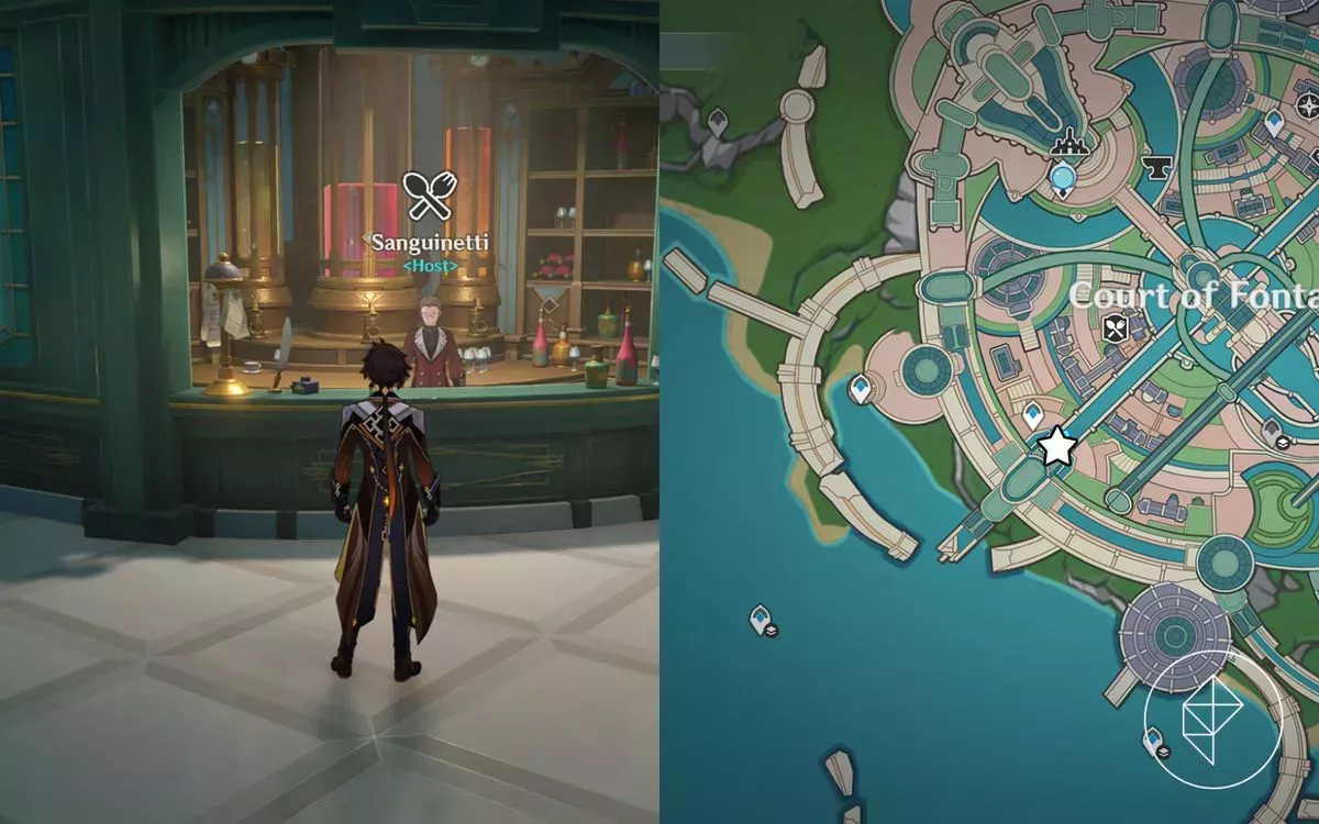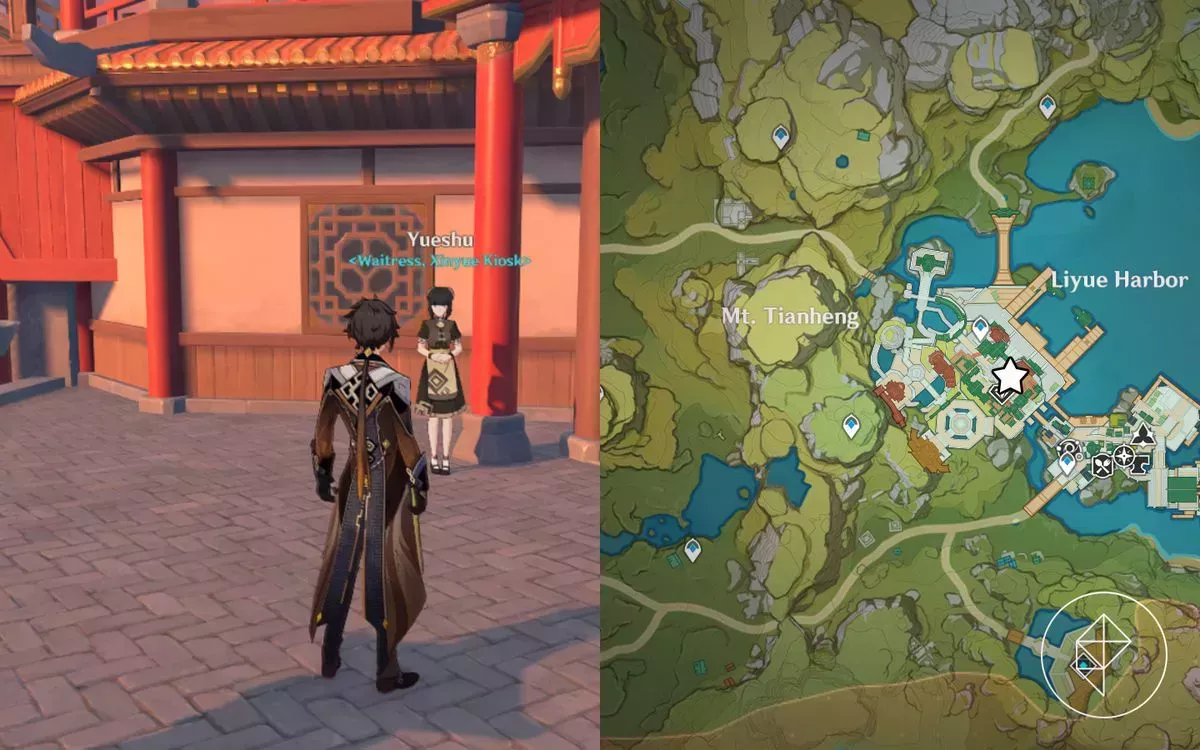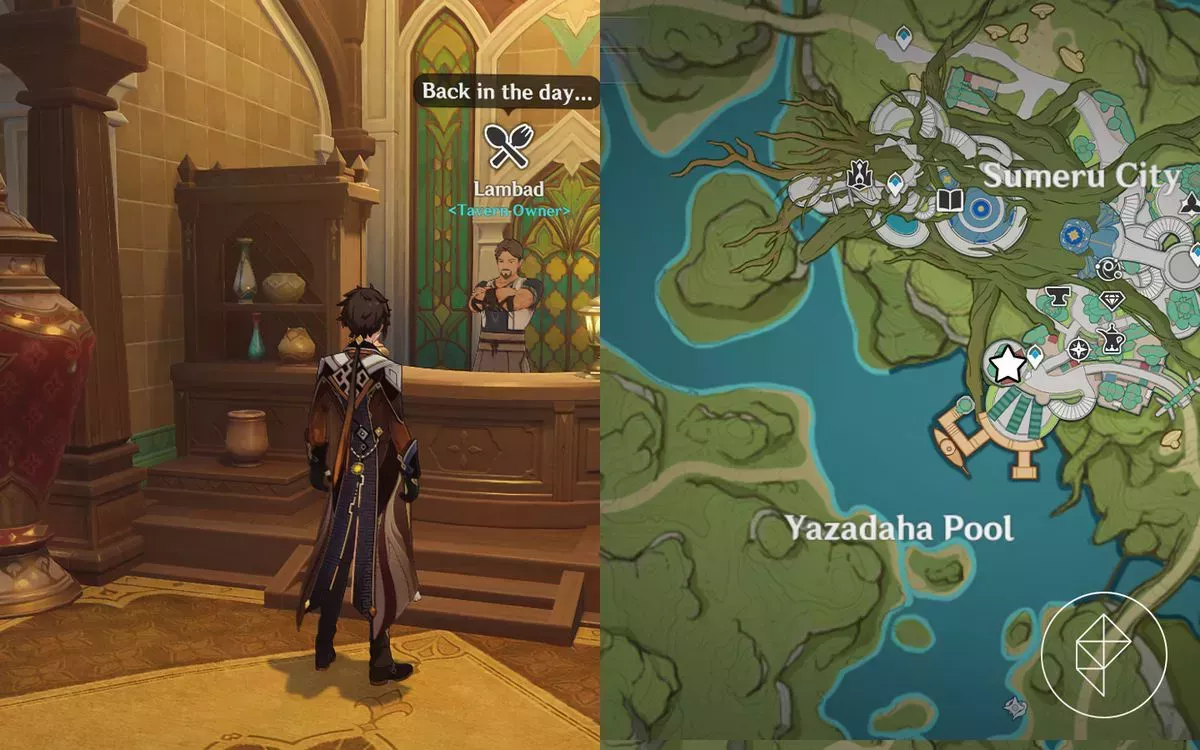 Enteka vende productos en la cafetería, marcada con una tetera en el mapa de Ciudad Sumeru.