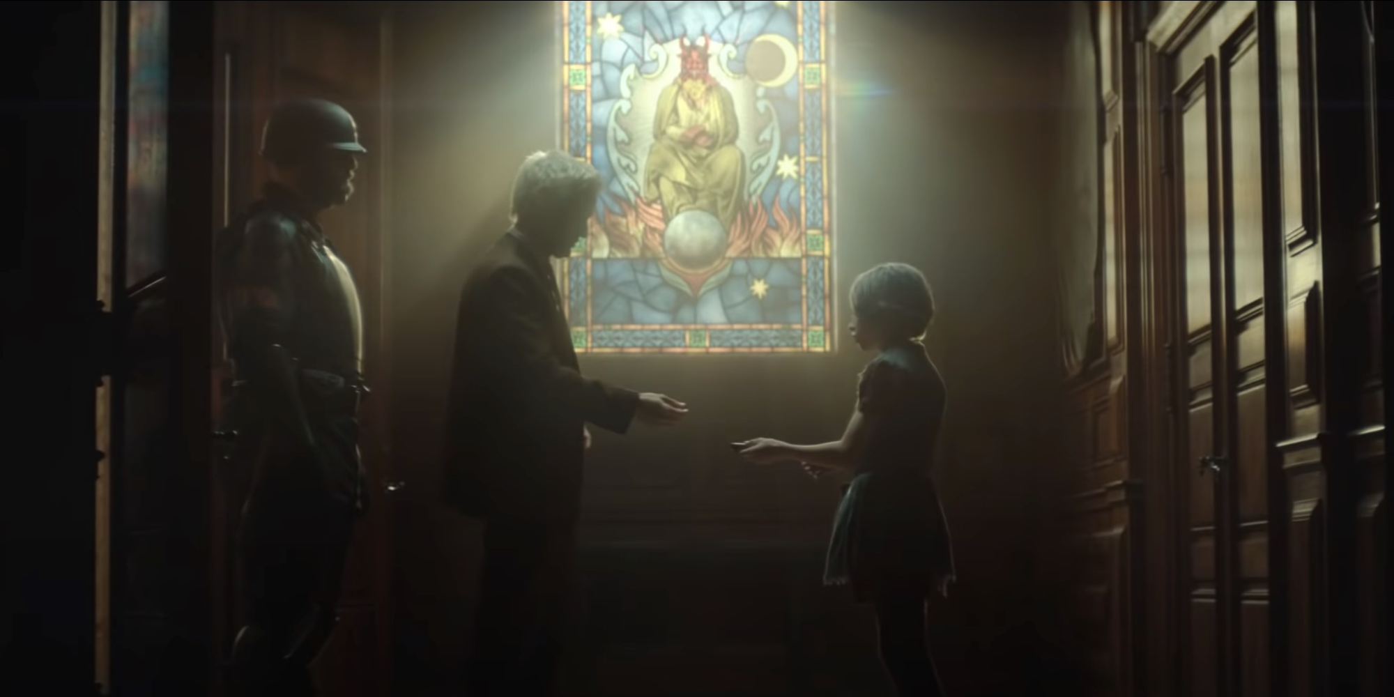 Esta teoría cobró fuerza cuando un panel de vidriera de una criatura parecida al diablo fue enmarcado en el centro de una toma del tráiler de Loki. La escena real se desarrolla en el episodio de estreno de la serie cuando el agente Mobius investiga una alteración de la línea de tiempo sagrada dentro de una iglesia francesa de la época del Renacimiento. La temática satánica se lleva aún más lejos cuando un niño ofrece un paquete de chicles azules y Mobius murmura la frase "un diablo que lleva regalos".