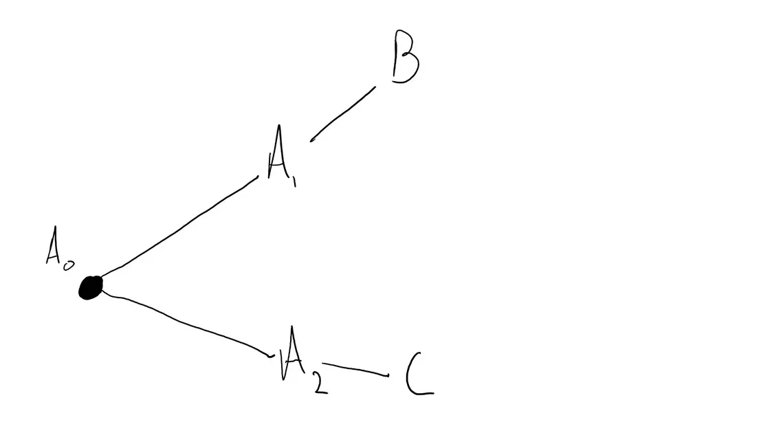 En esta figura, si empiezas en A0, tienes dos opciones: A1 y A2, y la elección de cualquiera de ellas seguirá dando lugar a la creación de dos universos. Independientemente de dónde acabes, no habrá ningún universo en el que pases de A1 a C o de A2 a B. En otras palabras, no hay forma de viajar entre las ramas del multiverso.