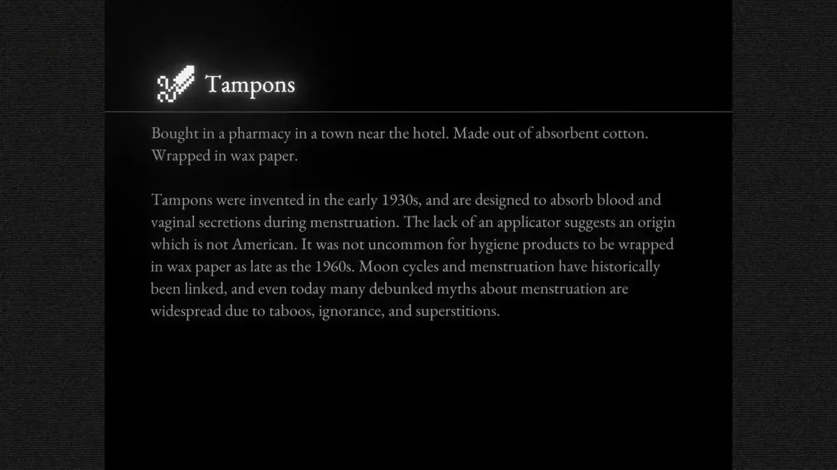destaca por muchas razones. Tiene rompecabezas enrevesadamente difíciles y un ambiente inconfundible que parece inspirado en el cine negro. Juegas como una mujer llamada Lorelei que deambula por un extravagante hotel y resuelve sus muchos misterios. El juego esconde un montón de secretos enrevesados, pero eso no es lo que más me intrigó. El mayor enigma de mi partida tenía que ver con un objeto único: un tampón.