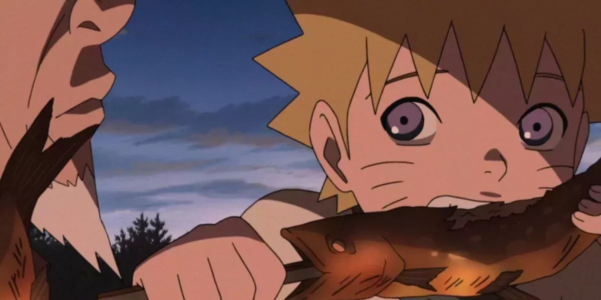 De niño, Naruto tiene poco dinero para comprarse comida, por lo que recurre a la pesca para subsistir. Resulta aún más impresionante que Naruto aprenda por sà mismo a pescar y a encender un fuego para cocinar a una edad temprana y sin ningún padre que le guÃe. Su pesca no sólo ilustra los humildes comienzos de Naruto, sino que también es un testimonio de su voluntad de perseverar ante la adversidad. Naruto no es el único personaje al que se ve comiendo pescado en un palo. Shisui e Itachi comen pescado juntos durante su descanso del entrenamiento.