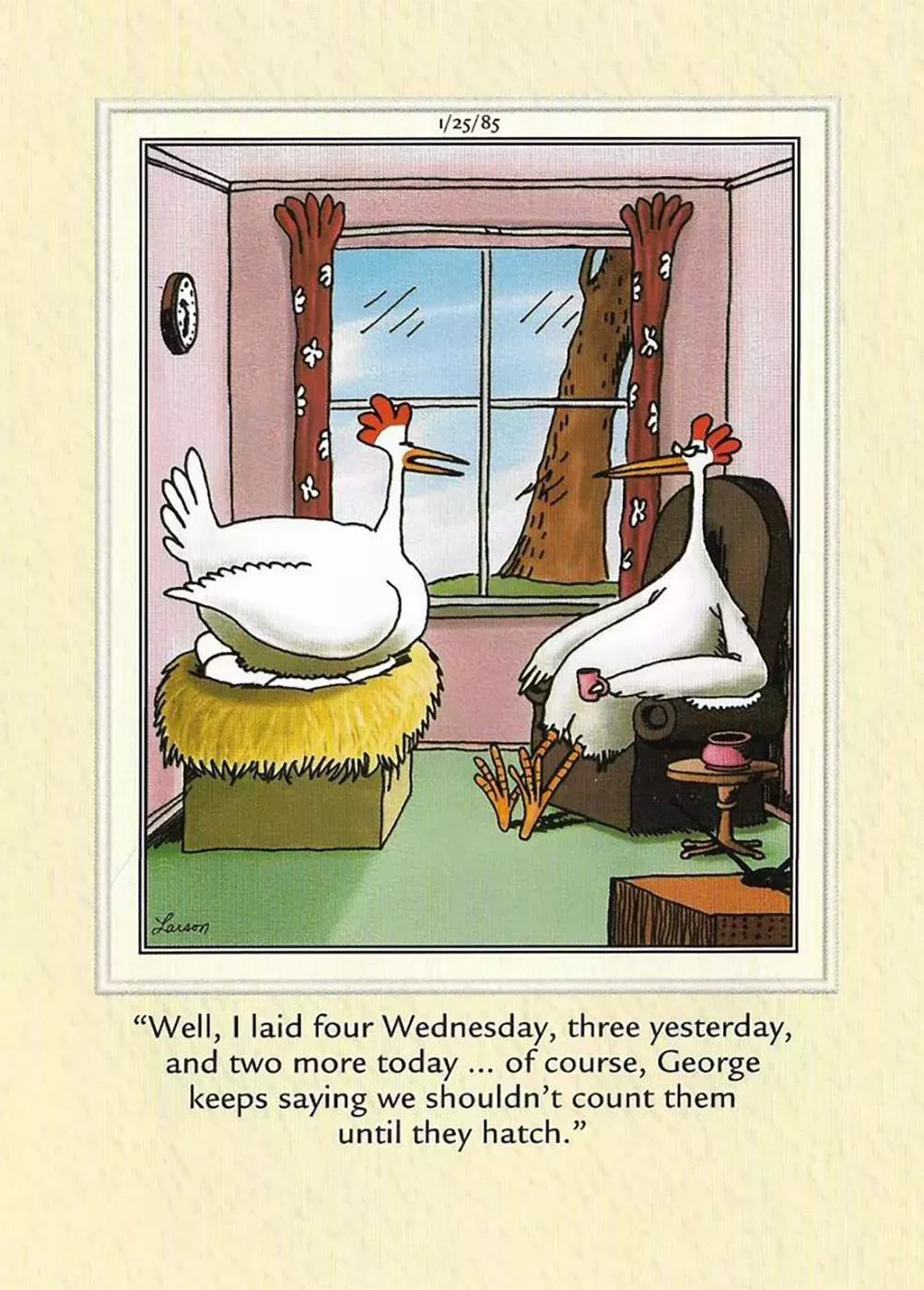 Don't count your chickens before they hatch" (No cuentes tus pollos antes de que salgan del cascarón) es una de las frases más tópicas de la lengua inglesa y, sin embargo, "The Far Side" encontró la forma de volver ingenioso e hilarante un tópico que ya se había repetido demasiado. Incluso casi 40 años después de su creación, la tira sigue siendo pertinente e ingeniosa, porque la gente necesita que se le recuerde con regularidad que nada está garantizado.