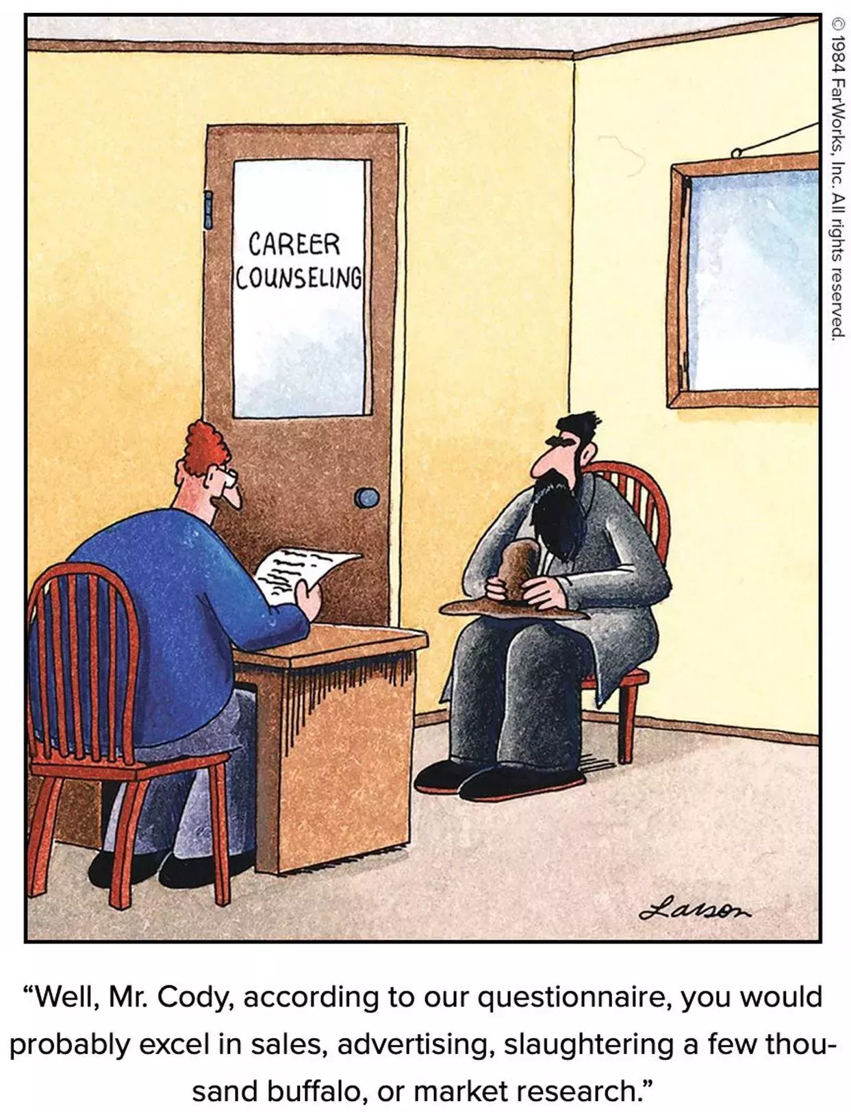 La orientación profesional ha evolucionado mucho en el último siglo y medio, sobre todo con la evolución de la industria y la tecnología. Dicho esto, cualquiera que se haya sentado alguna vez con un orientador profesional sabe que un simple test no puede predecir exactamente las mejores opciones profesionales para una persona. Son muchos los parámetros que intervienen a la hora de determinar cuál es la mejor opción, y The Far Side ya tomó nota de ello a principios de los años ochenta.