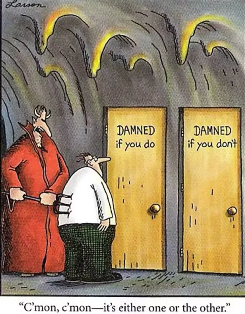 La vida nos pone ante decisiones difíciles todos los días, y hay veces en las que está claro que, independientemente de la elección que hagamos, "estás condenado si lo haces, estás condenado si no lo haces". Es otro cliché popular, que parece haber existido desde el principio de los tiempos. Utilizar al diablo para explicar este punto puede que no le dé un giro totalmente nuevo, pero sin duda hace que las consecuencias parezcan mucho más terribles, y eso es lo que lo hace inteligente. Es muy fácil de entender, incluso para los que no tienen inclinaciones religiosas.