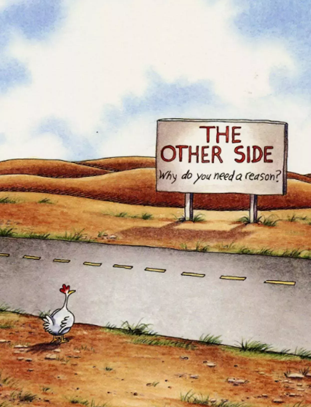 2La gente lleva contando este chiste desde hace al menos un siglo, y la respuesta siempre es diferente. Sería casi más extraño si Larson no hubiera encontrado la manera de trabajar con esta pregunta tan simple del pollo, convirtiéndola en algo inteligente y profundo. Cuando el pollo se para al borde de la carretera, mirando al otro lado, la señal es muy clara: ¿Por qué necesitas una razón?