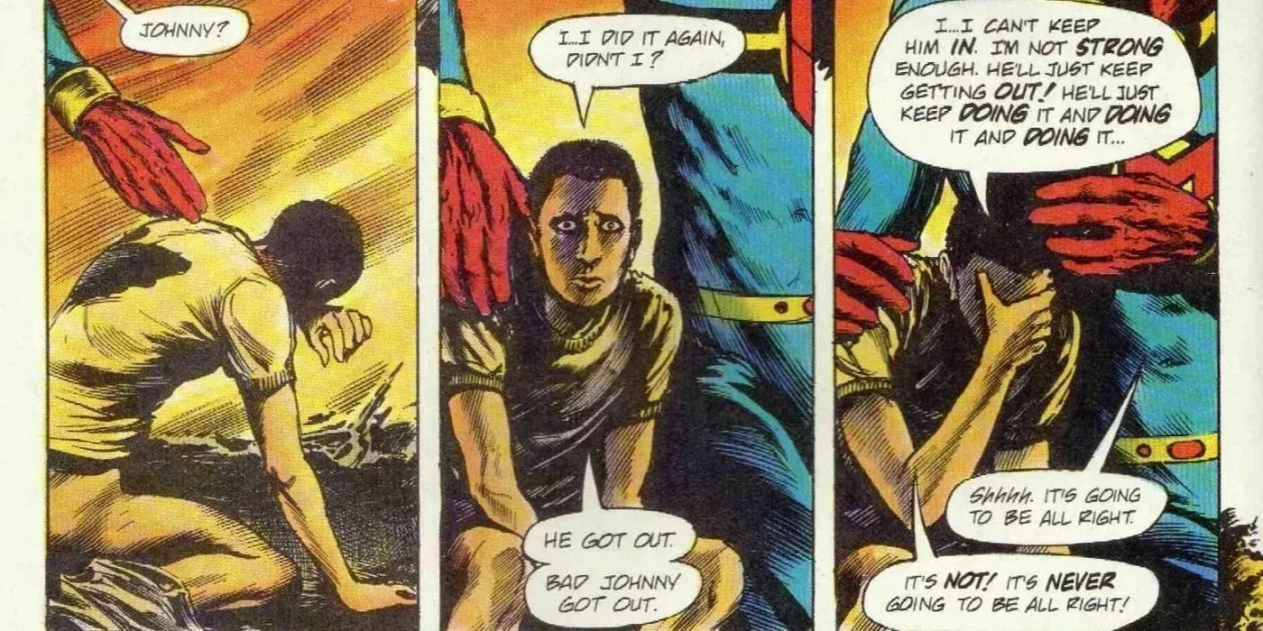 La historia más inquietante de la serie es la de Kid Marvelman. En la serie original, Kid Marvelman era un compañero genérico de Marvelman, pero en el reinicio de Moore, Kid Marvelman creció hasta convertirse en un villano con poderes divinos. Miraclelman fue capaz de convertir a Kid Marvelman en su alter ego, un joven llamado Johnny. Pero cuando Johnny estuvo a punto de ser violado por una banda de chicos mayores en un hogar de acogida, Kid Marvelman tomó el control, mató a los chicos mayores y destruyó Londres. El arte de John Totleben da vida a los horrores de la historia de una manera realmente perturbadora.