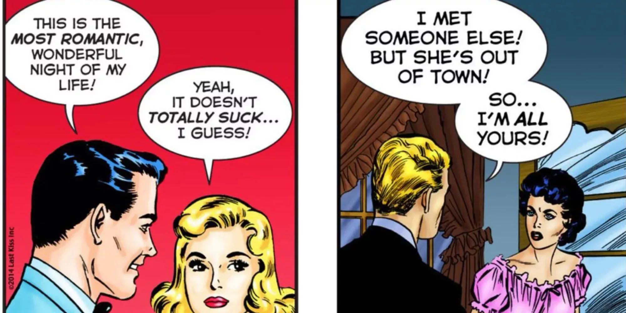 Last Kiss es una serie de cómics que toma cómics románticos antiguos, actualiza el arte y cambia el diálogo para comentar las normas sociales y la vida en pareja. Este cómic resulta chocante, ya que el arte sugiere conversaciones sanas y dulces entre los personajes. Pero sin censores morales como el Comics Code Authority, que frena a los creadores, los cómics son más explícitos en sus diálogos.