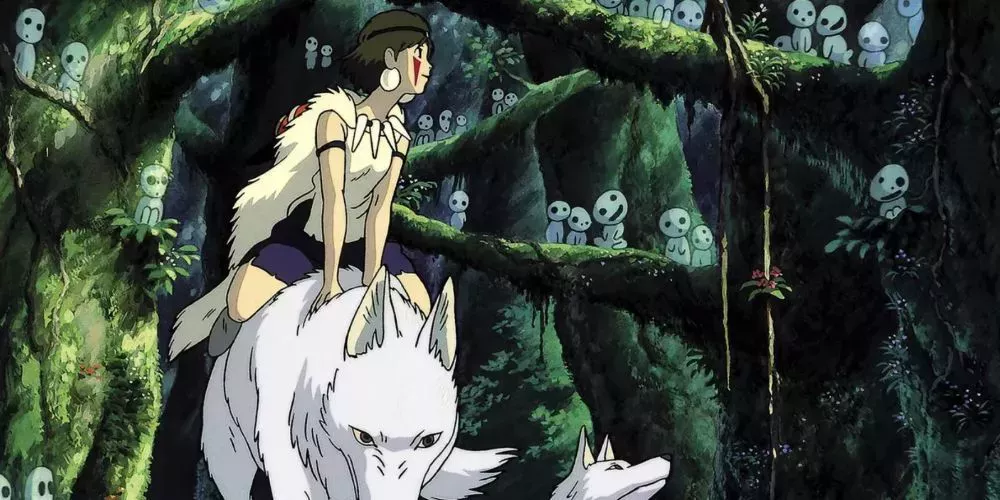 Dioses y pequeños espíritus llamados Kodama llenan la antigüedad en La Princesa Mononoke. Los gigantescos y nudosos árboles tiñen el lugar de una sombra azulada, y el Espíritu del Bosque con cuernos vigila a todos los habitantes. Cuando Ashitaka se hiere, la niña lobo San lo lleva a un estanque que es sagrado para el Espíritu del Bosque, y lo deposita entre el agua clara y las orillas cubiertas de musgo.