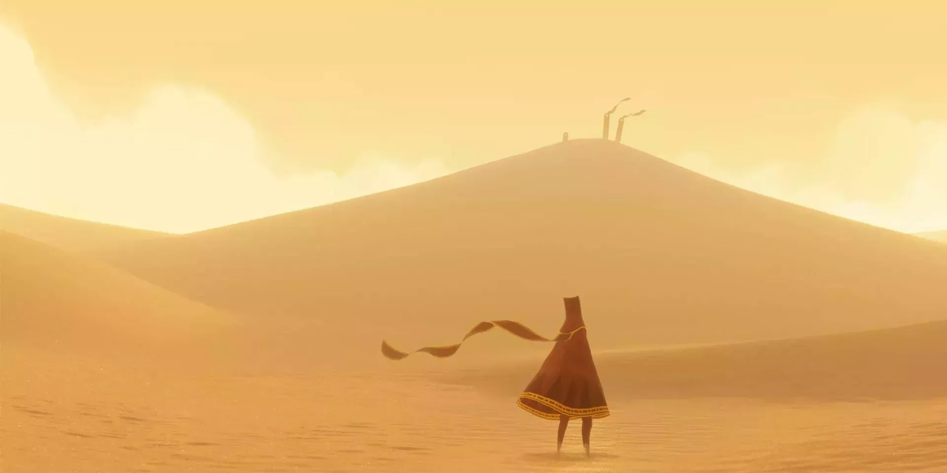2 ViajeTras el éxito de Flower, Joan Chen volvió a ofrecer a los jugadores un título de gran resonancia emocional llamado Journey. Este clásico de PlayStation 3 ponía a los jugadores a los mandos de una misteriosa figura con túnica mientras atravesaban un vasto desierto para llegar a la cima de un majestuoso pico.