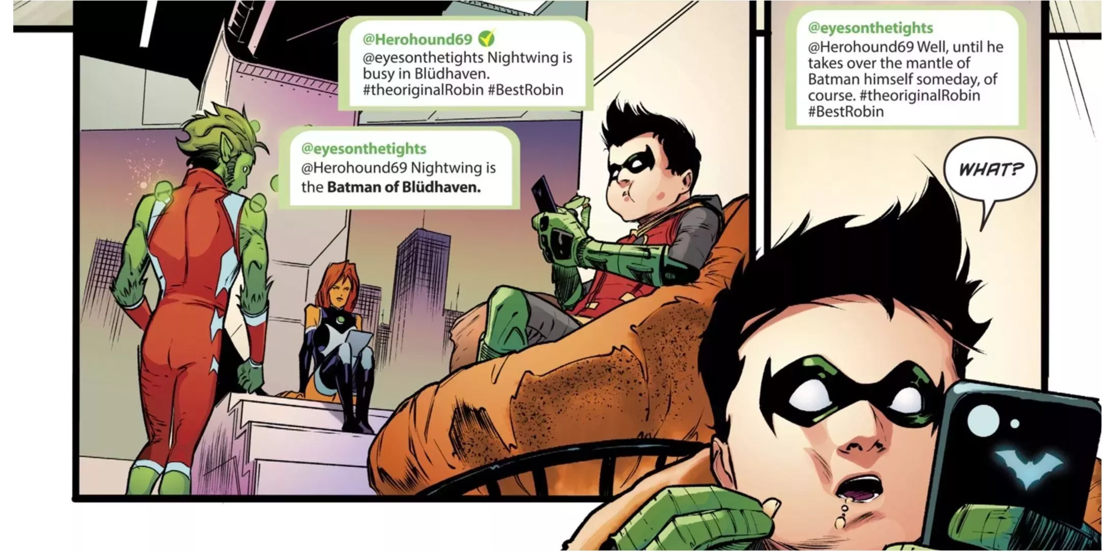 Algunas de las travesuras de Damian incluyen indignarse por una publicación en las redes sociales en la que se afirma que Dick Grayson debería ser el próximo Batman y pasar seis horas implacables hackeando la cuenta de Tim Drake. A estas alturas, es evidente que la mayoría de sus adorables vicios van directamente dirigidos a sus Bat-Hermanos.