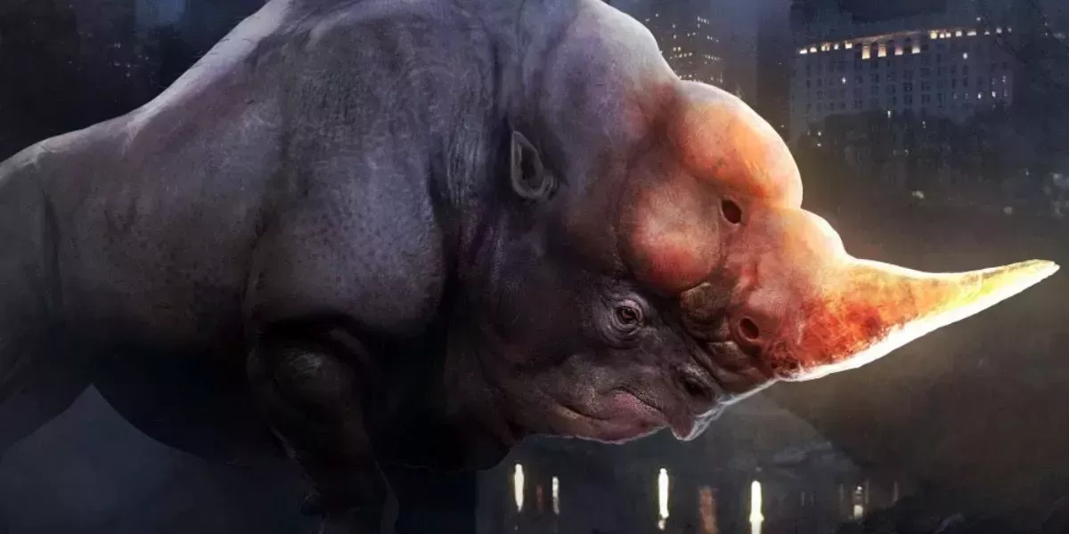 Según Scamander, el Erumpent "tiene una piel gruesa que repele los encantos y las maldiciones; un cuerno grande y afilado en la nariz; y una cola larga como una cuerda" Esta bestia parecida a un rinoceronte es sorprendentemente sumisa, excepto cuando es época de apareamiento. Sus cuernos contienen un líquido volátil que los transforma en bombas de color naranja neón.