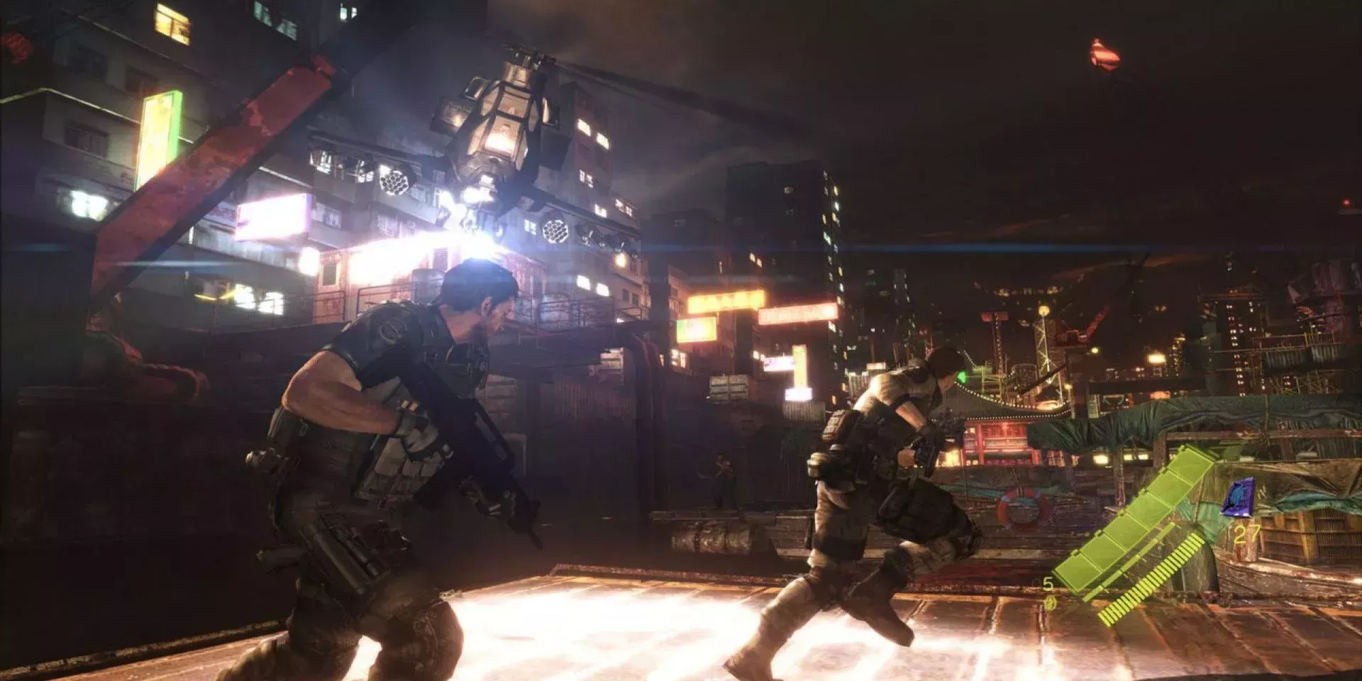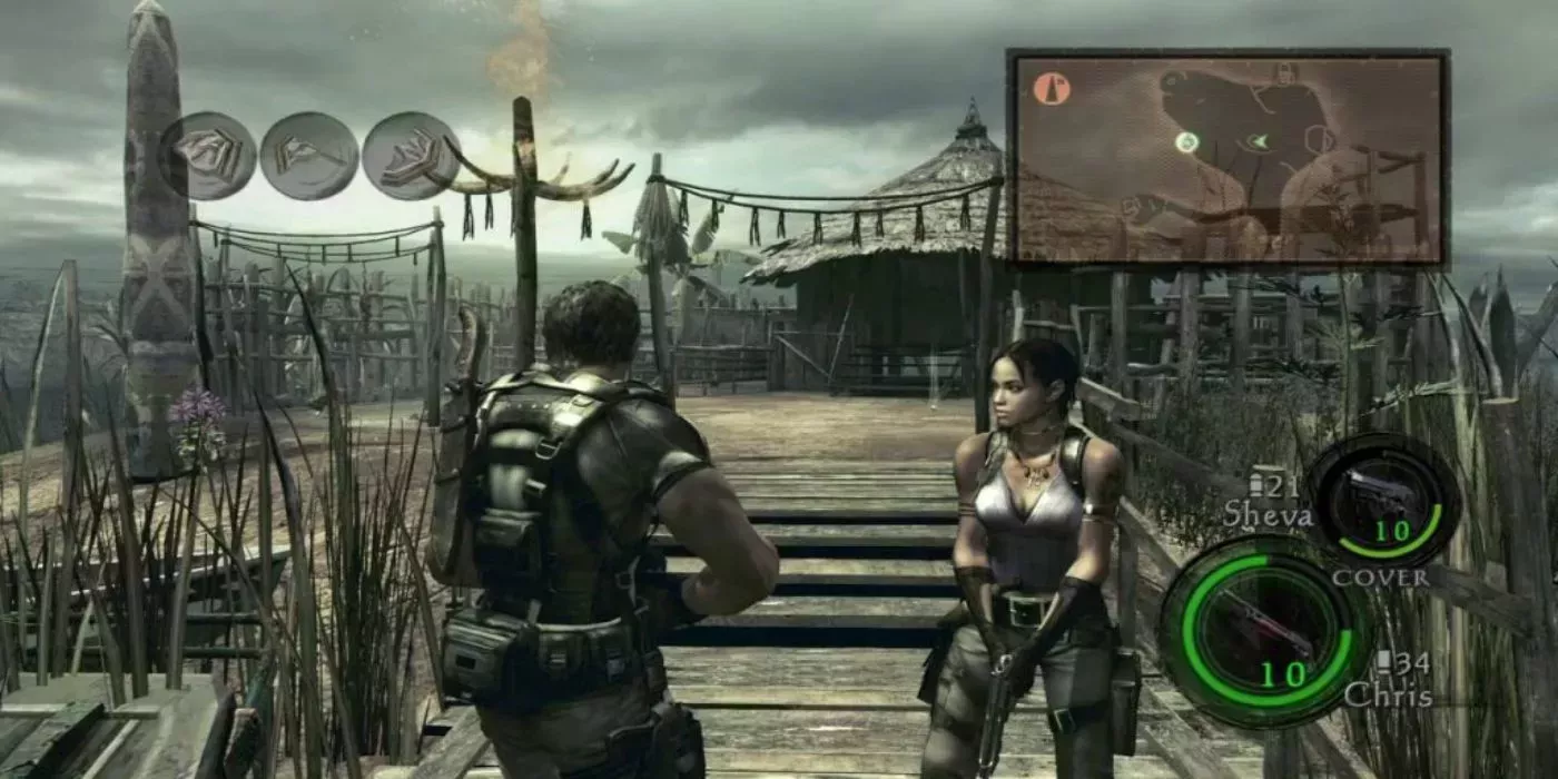 Resident Evil 5 continuó la tendencia marcada por RE4 al favorecer la acción sobre los sustos. Esto se ve subrayado por la inclusión de un compañero cooperativo, una novedad en la serie principal de Resident Evil. Tanto si los jugadores juegan solos como si lo hacen con un amigo, Chris estará acompañado por Sheva Alomar, una compañera agente de la Alianza para la Evaluación de la Seguridad del Bioterrorismo (BSAA).