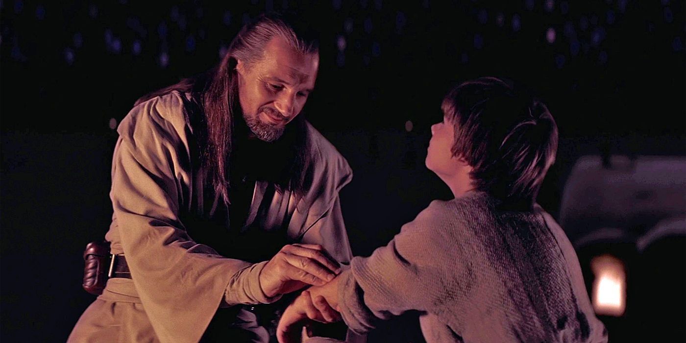 Cuando Anakin era apenas un niño, Qui-Gon Jinn se acercó a él, y fue Qui-Gon quien pudo tranquilizar a Anakin. Al ver el sable de luz de Qui-Gon Jinn, Anakin supo que estaba con los Jedi al fin, y supo que estaba a salvo. Fue Qui-Gon quien salvó a Anakin; fue Qui-Gon quien se convirtió en su primer y más cercano amigo fuera de Tatooine, y los dos eran casi como padre e hijo.