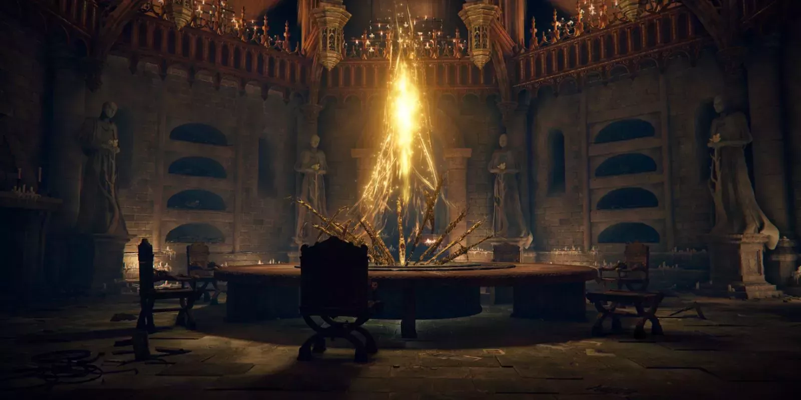 Fácilmente uno de los lugares más importantes y vitales de todo el juego, la Mesa Redonda es un centro libre de enemigos que ofrece a los jugadores una gran variedad de servicios. La Mesa Redonda no es accesible inmediatamente al principio del juego; hay muchas formas de recibir la invitación a la Mesa Redonda, pero la más común es activar un Lugar de Gracia en el mapa del mundo que no esté en Limgrave y enfrentarse a Margit el Presagio de la CaÃda en combate. Melina aparecerá y extenderá la invitación a la Mesa Redonda. Una nota importante a tener en cuenta es que esta ubicación sólo está disponible a través de Viaje Rápido mediante el Mapa del Mundo, situado en la esquina inferior izquierda.