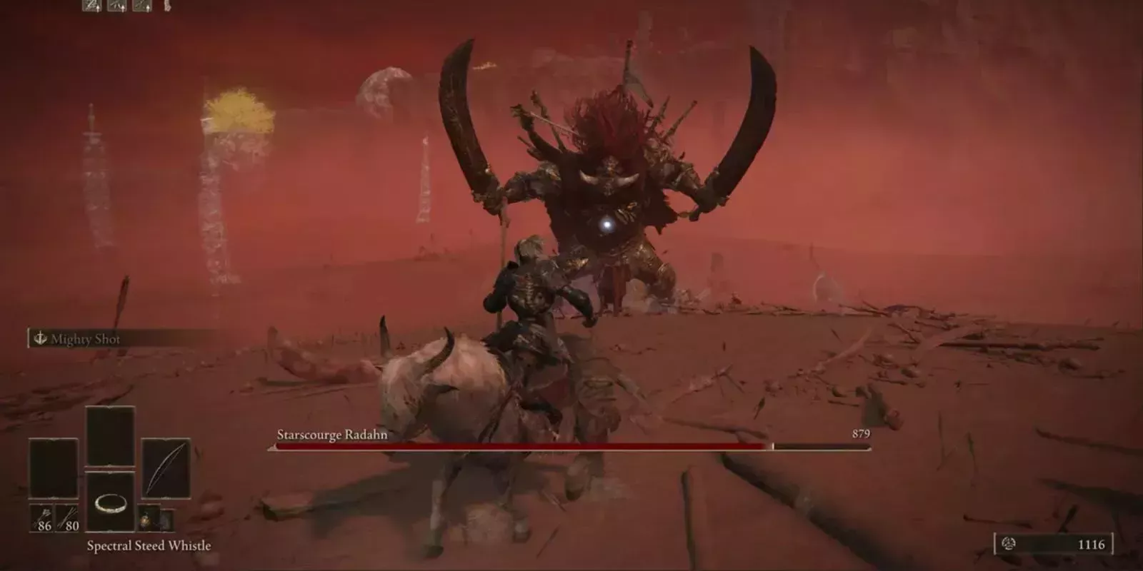 A través de este portal, los jugadores serán transportados a las Dunas de los Lamentos, el campo de batalla donde se enfrentarán a Radahn. Derrotar a Radahn puede parecer extremadamente imponente (teniendo en cuenta que uno de sus ataques consiste en lanzarse como un cometa directamente desde el cielo), pero los jugadores que sepan mantener la cabeza frÃa y utilizar la ayuda de los numerosos iconos de invocación del campo de batalla conseguirán la victoria. Al derrotar a Radahn no sólo se desbloquea su equipamiento completo, sino también el camino especial a Nokron, Ciudad Eterna, una zona que da acceso a uno de los objetos más poderosos del juego.