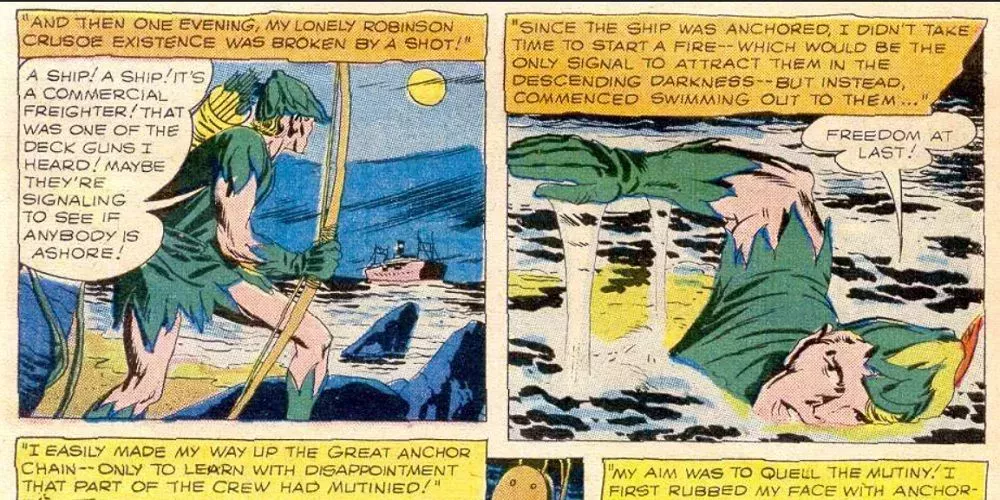 El aterrizaje de Flecha Verde en la isla es bastante consistente en todos los orígenes. La forma en que desembarca difiere de una historia a otra. En su origen de la Edad de Plata, detallado en Adventure Comics (Vol. 1) nº 256 , Oliver ve por casualidad un barco que pasa por delante de la isla. Nada hasta él y se ve obligado a salvar a la tripulación de unos piratas antes de volver a casa.