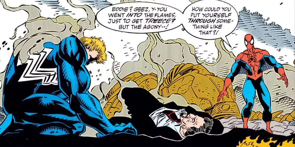 Un intenso thriller que examina las vías de dolor que puede soportar Venom, Venom: The Finale ejemplifica la naturaleza de la vida de Eddie Brock con un simbionte. Aunque se le conceden habilidades impresionantes, es una experiencia inmensamente dolorosa, ya que esencialmente se siente por dos. Un momento particularmente agonizante llega cuando a Venom se le implanta una bomba de termita como medio de control. Endureciéndose, Eddie Brock suplica al simbionte que elimine el explosivo de su cuerpo. El plan funciona y habla de la fuerza de Eddie así como de las capacidades de Venom.