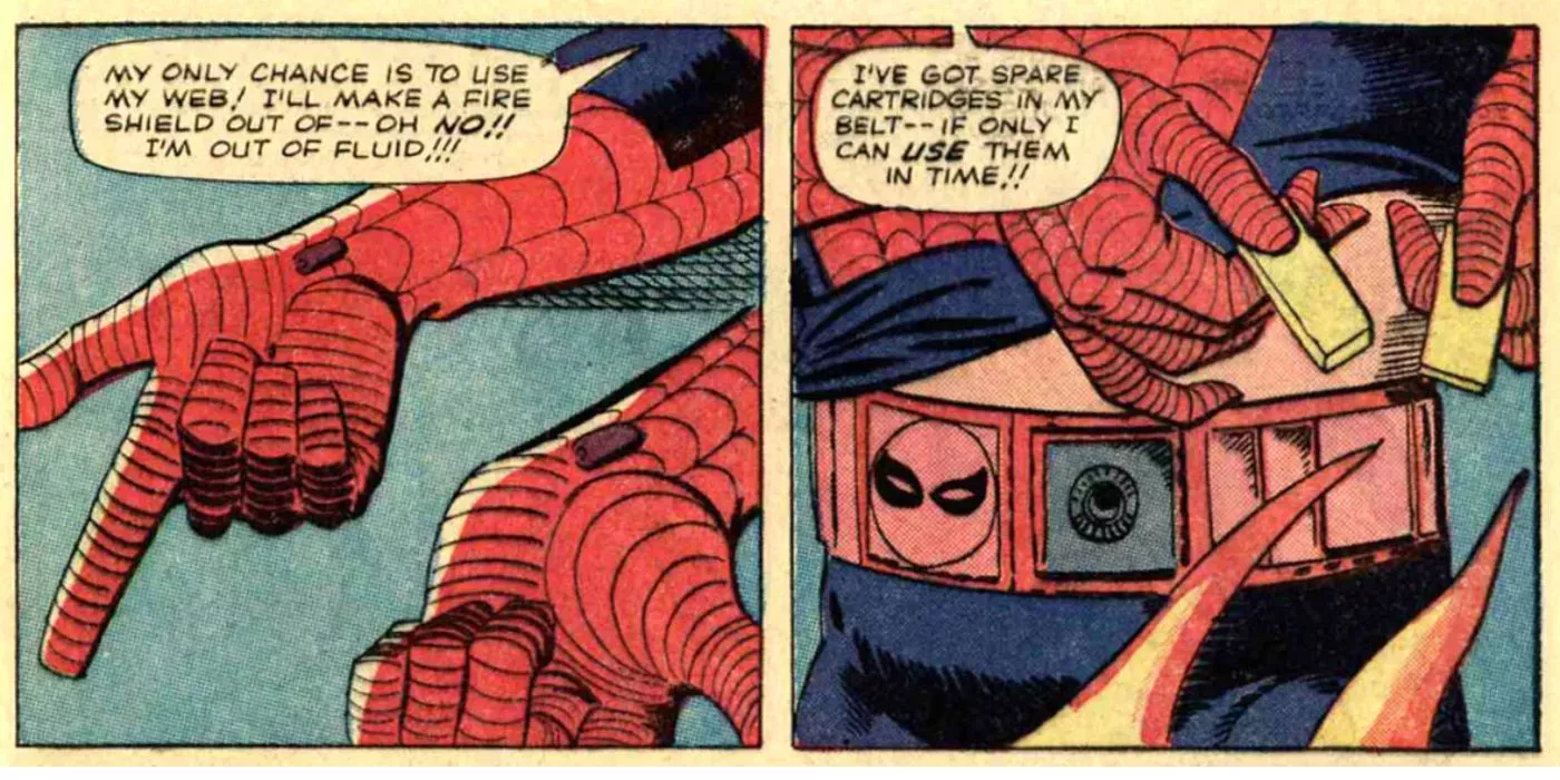 Como las telarañas de Spidey no suelen ser orgánicas, tiene un suministro limitado de fluido para telarañas. Tiene que crear constantemente nuevo fluido y rellenar sus cartuchos de telaraña. Como resultado, Spider-Man ha tenido que preocuparse de quedarse sin fluido en momentos inoportunos, como a mitad de un movimiento o durante una batalla, lo que puede marcar la diferencia entre la vida y la muerte.