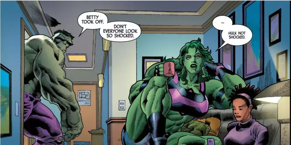 Betty y Bruce tienen Hulk. Dado que el sÃndrome de Hulk hace que se formen y surjan identidades distintas, la interacción entre las múltiples caras de esta pareja oscila entre el poliamor amoroso y la pura toxicidad. En cualquier caso, Betty dejó claro a Hulk y a Bruce que no iba a ir a ninguna parte en Hulk inmortal, de Al Ewing .