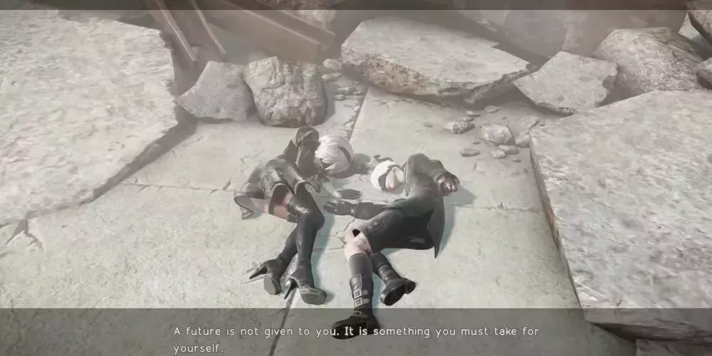 A pesar de sus elementos inusuales y alocados, NieR: Automata es un juego innegablemente trágico. A lo largo de tres partidas, el jugador debe ver cómo sus tres simpáticos protagonistas sufren, se enfrentan a la traición y se ven obligados a matarse uno a uno. Los cuatro primeros finales del juego son desoladores y terminan con la muerte de los tres, habiendo conseguido muy poco.