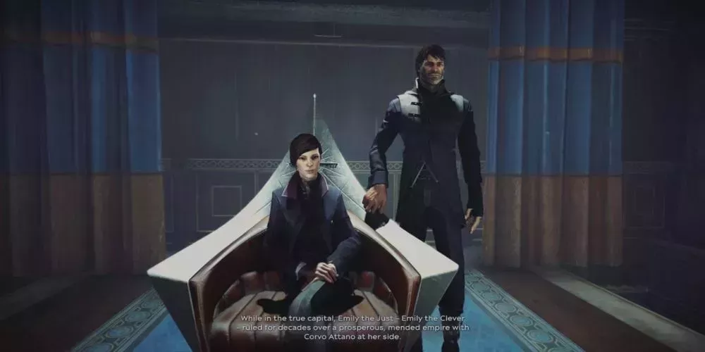 El final deDishonored es bastante feliz, pero queda anulado por la existencia de Dishonored 2. En cambio, el final de ese juego pone a Emily y a Corvo en un lugar feliz. Corvo trabaja para mejorar vidas en lugar de acabar con ellas, y Emily se convierte en una gobernante madura y sabia gracias a sus experiencias.