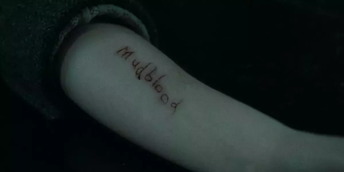 Hacia el final de Harry Potter y las Reliquias de la Muerte - Parte 1, Bellatrix Lestrange y sus compañeros mortífagos torturan a Hermione y a sus amigos en la Mansión Malfoy. En los libros, Bellatrix corta el cuello de Hermione, pero en la adaptación cinematográfica, Bellatrix graba la palabra "mudblood" en el brazo de Hermione.