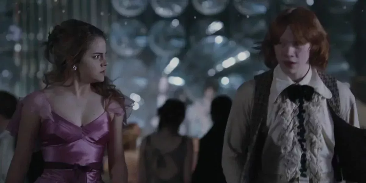 El Baile de Yule, que aparece en Harry Potter y el Cáliz de Fuego, hace aflorar la tensión romántica entre Ron y Hermione. En los libros, el limitado punto de vista de Harry inhibe la profundidad que los lectores experimentan en la relación entre Ron y Hermione.