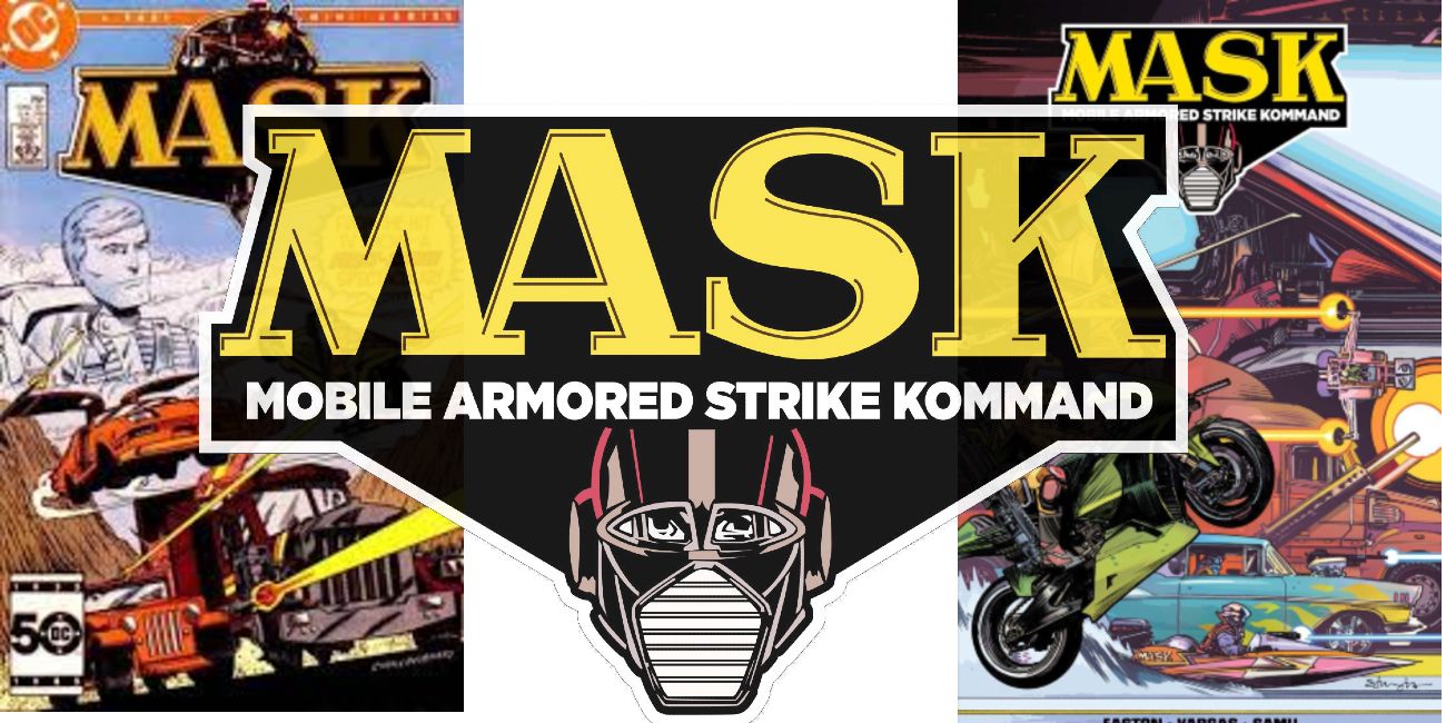 Hay muchas máscaras icónicas en los cómics. Algunas de las más singulares aparecieron en la serie M.A.S.K. (Mobile Armored Strike Kommand) de DC Comics de 1985, escrita por Michael Fleisher y dibujada por Mike Chen. M.A.S.K. era una línea de juguetes de Kenner que combinaba un poco de Transformers y Joes, con vehículos que se transformaban en otros vehículos, y figuras de acción más pequeñas de 2,5" que llevaban máscaras para controlarlos. La batalla entre M.A.S.K. y V.E.N.O.M. continúa en los cómics de IDW.