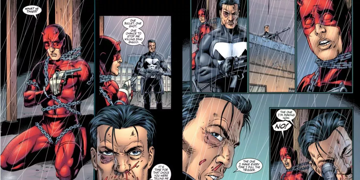 La postura de Daredevil contra el asesinato es firme, mientras que Punisher ensangrentará incansablemente sus manos. El arco argumental "Juego de niños" de Frank Miller y Klaus Janson fue un memorable debut para esta tenue dinámica, y esa reputación se mantiene hasta bien entrado el actual arco argumental de Daredevil "La saga del puño rojo", bajo la dirección de Chip Zdarsky y Marco Checchetto.