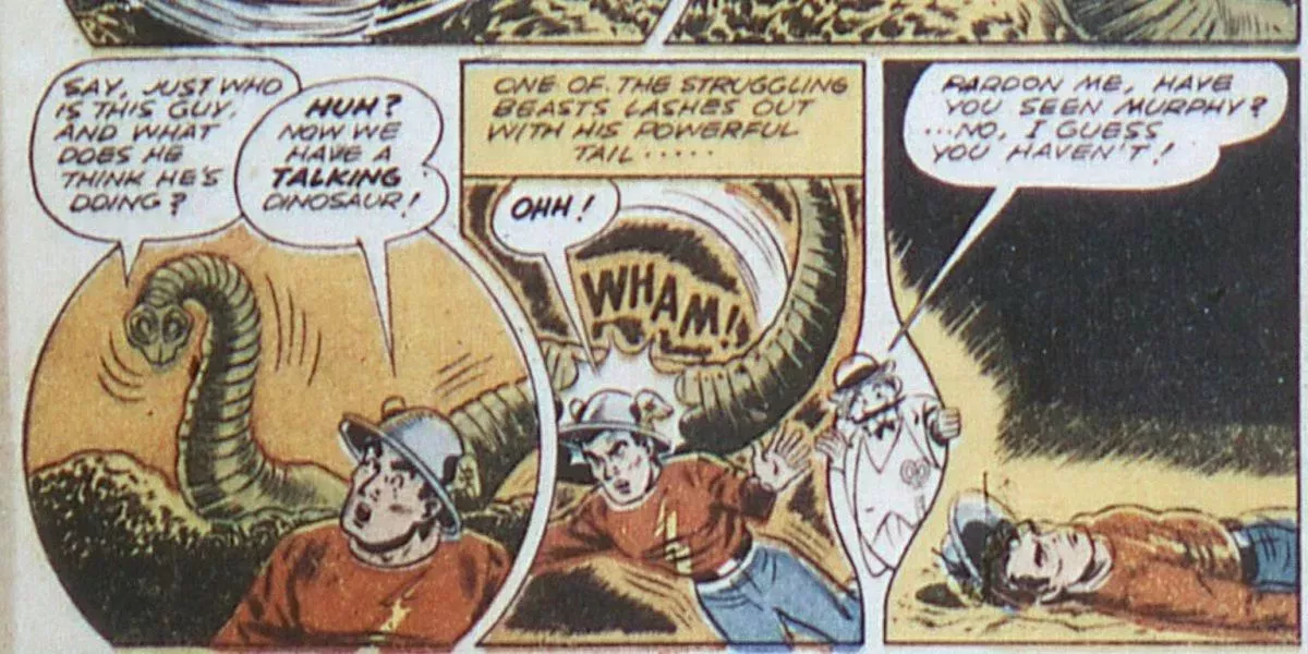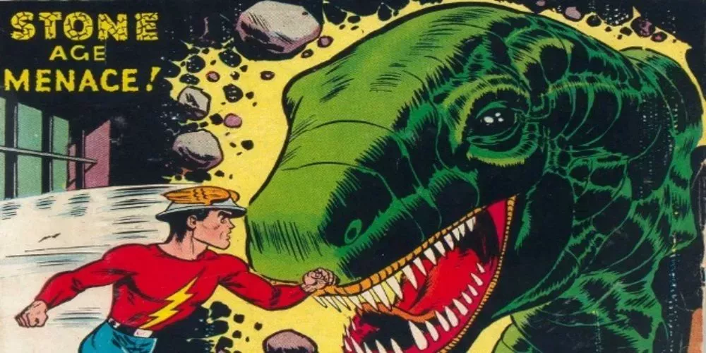 Siguiendo con el tema prehistórico, "Stone Age Menace" del escritor Robert Kanigher y los artistas Lee Elias y Joe Kubert de Flash Comics #86 ve de nuevo al Velocista original enfrentándose a dinosaurios. Sin embargo, esta vez hay un giro inteligente.
