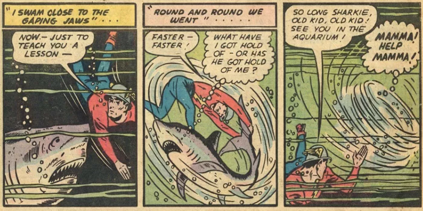 No importa la época, Flash siempre ha utilizado sus poderes de forma ingeniosa. En esta historia, Garrick se deshace de un tiburón creando un remolino y utiliza su supervelocidad para convertirse en una hélice y desviar el rumbo del barco pirata. Las mejores historias de Flash ponen de manifiesto el ingenio del hombre más rápido del mundo, y este número no es una excepción.